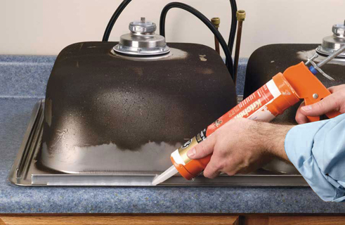 Attach all plumbing connections to the house drain line and water supply tubing. Apply a bead of silicone caulking around the perimeter of the sink where it meets the counter to seal any gaps. Fill the sink with water and leave it overnight to add weight and help it settle in place. Afterward, re-tighten the sink clips if necessary.