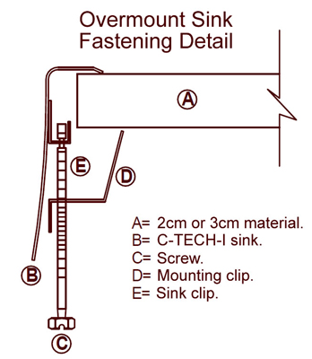Use mounting clips to pull the sink down tight to the countertop. These clips hook onto the sink lip from below the countertop. Tighten with a screwdriver.